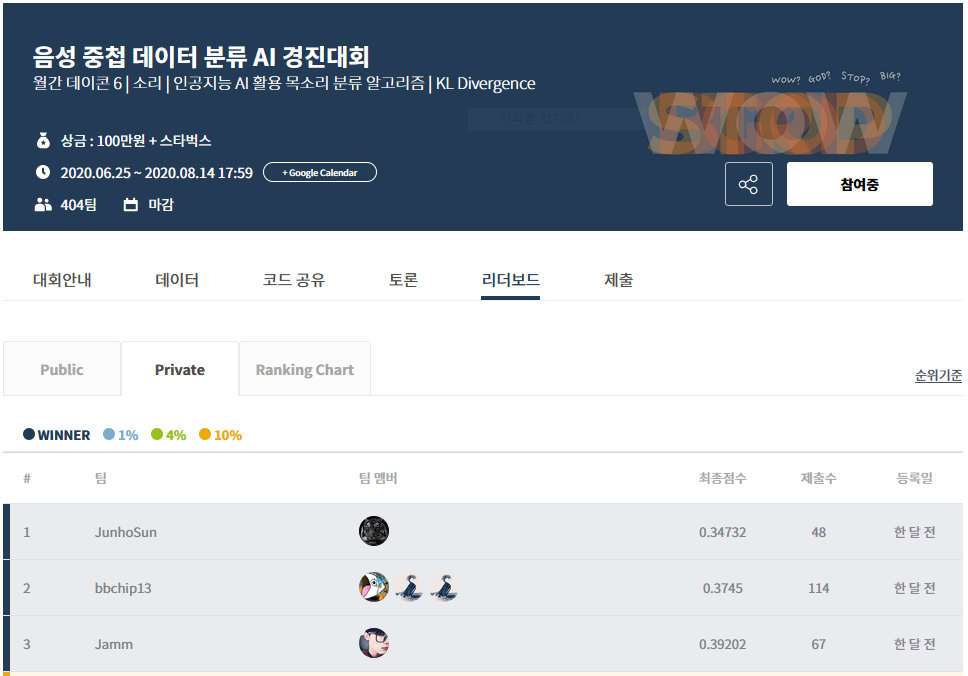 월간 데이콘 13으로 진행되었던 운동 동작 분류 AI 경진대회에서 최종 3위를 기록하게 되었습니다. 무야호~