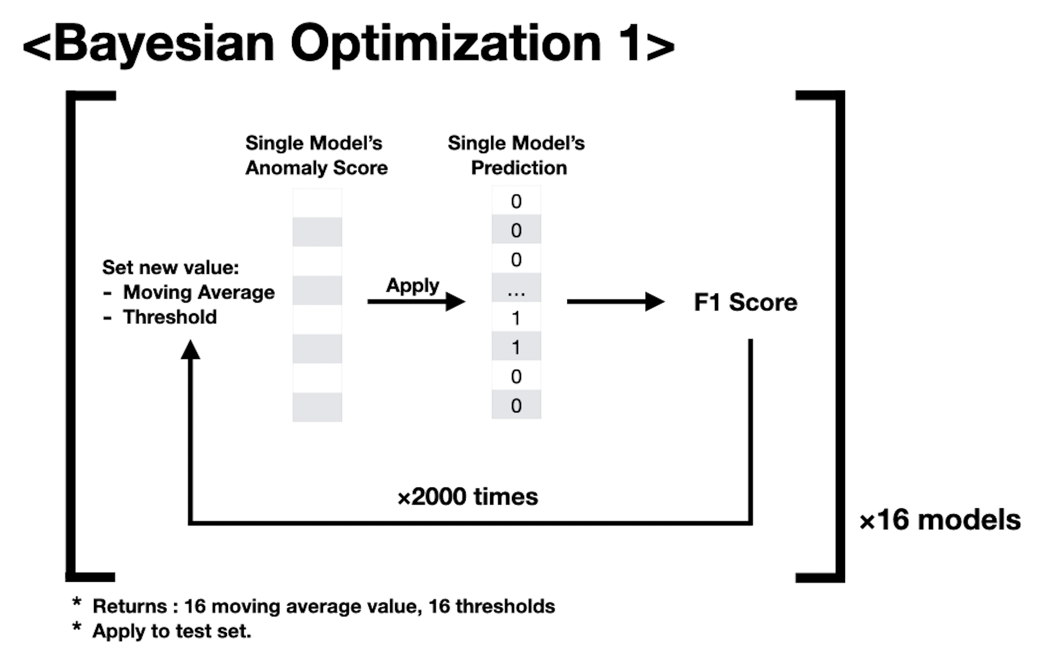 모델만큼 성능에 중요한 영향을 끼친 부분은 Threshold 를 정하는 일이었습니다. Threshold 는 optuna 를 사용하여 2000회의 반복을 통해서 결정하였습니다. 무작정 RandomSearch 를 하는 것 보다는 Bayesian Optimization 을 하는 것이 좋다고 판단했고, 평소 하이퍼파라미터 튜닝에 optuna 를 많이 사용해서 익숙한 함수를 만들듯이 적용할 수 있었습니다. 먼저 16개 예측값에 대하여, 이동 평균을 이용해 예측 결과물을 smoothing 시키고, threshold 를 결정해 [0, 1, 0, 0, ...] 과 같은 예측 결과물을 만들었습니다. 적용할 이동평균 값과 threshold 를 아래 그림과 같이 반복을 통하여 구했습니다.