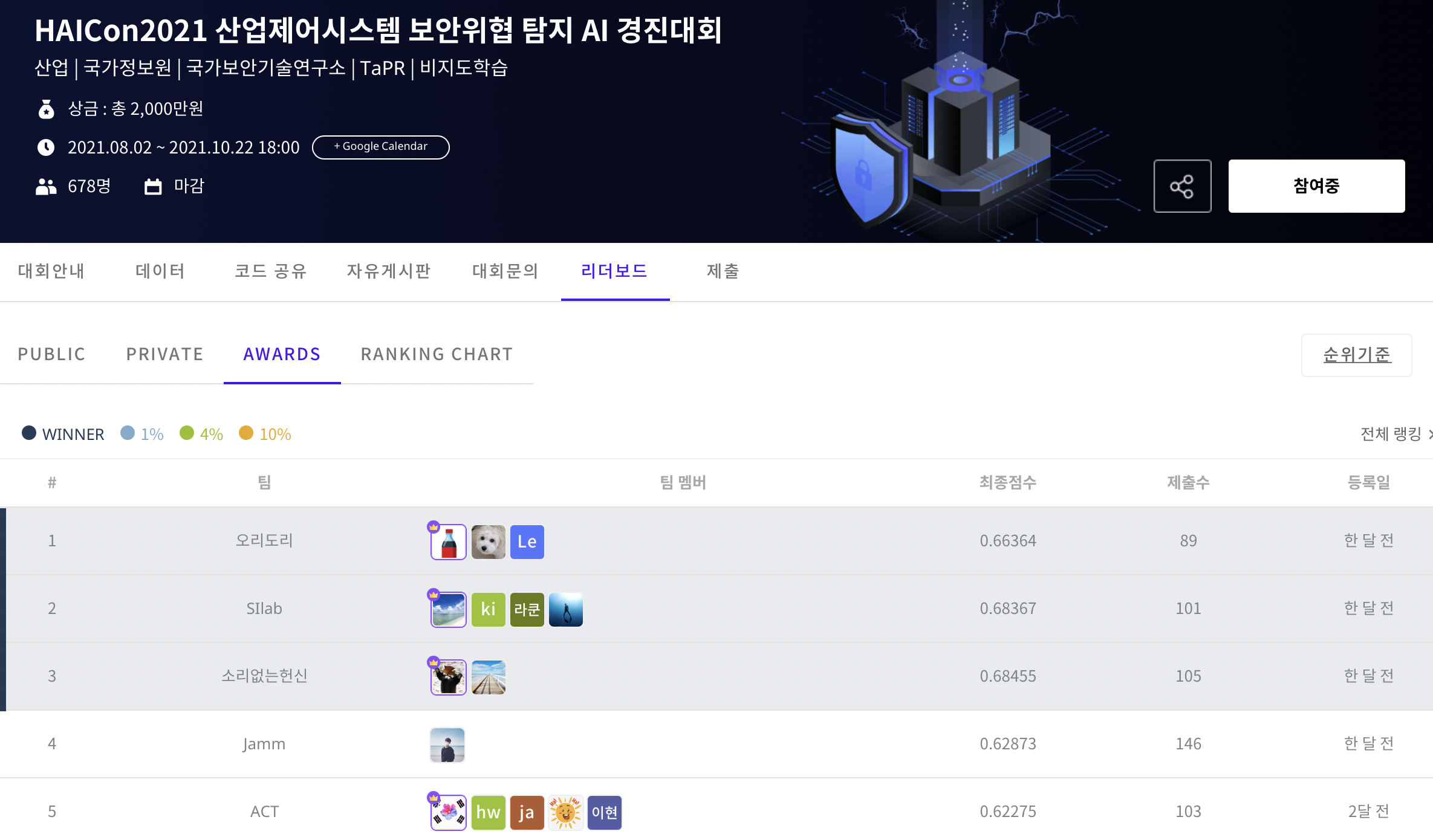 1년만에 큰 대회에서 한번 더 수상을 하게 되었습니다. 국가정보원, 국가보안기술연구소에서 주최하고, Dacon 에서 운영한 HAICon2021, 산업제어시스템 보안위협 탐지 AI 경진대회에서 4위와 특별상을 수상하게 되었습니다.