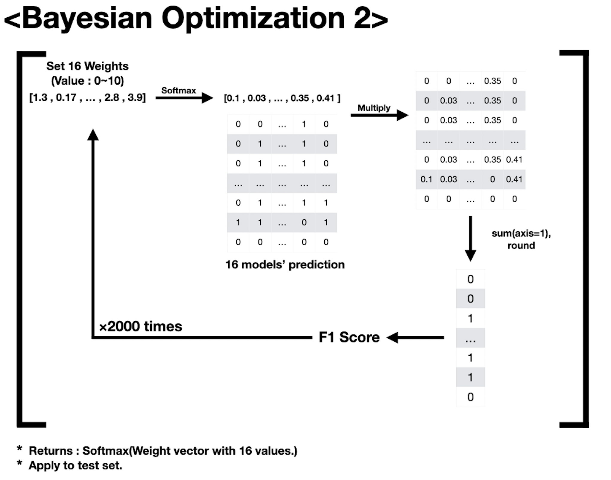 다음으로는 16개 예측 결과를 조합하는 과정 역시 optuna 를 이용해서 만들었습니다. 0과 1로 이루어진 예측 결과물들을 softmax 함수를 거친 weight vector 를 통해 Soft Voting 하도록 하였습니다.